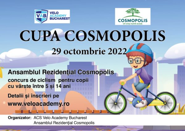Chiar dacă toamna și-a intrat în drepturi, noi tot credem că vremea bună le surâde cicliștilor și că distracția generată de o cursă frumoasă pe două roti aduce bucurie oricând are loc. Așa că, Velo Academy Bucharest vă invită în 29 octombrie 2022, la Ansamblul Rezidențial Cosmopolis, pentru a pedala la Cupa Cosmopolis, o competiție distractivă dedicată copiiilor!